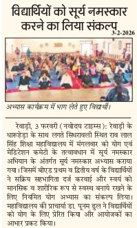 Surya Namaskar practice sessions were conducted from 3rd to 9th February as part of the “Surya Namaskar Abhiyan-2026”. All the students actively participated in the event. On the first day of the event, students were guided about the 12 Surya Namaskar poses. The event aimed to raise awareness about yoga and its importance in promoting physical and mental health.